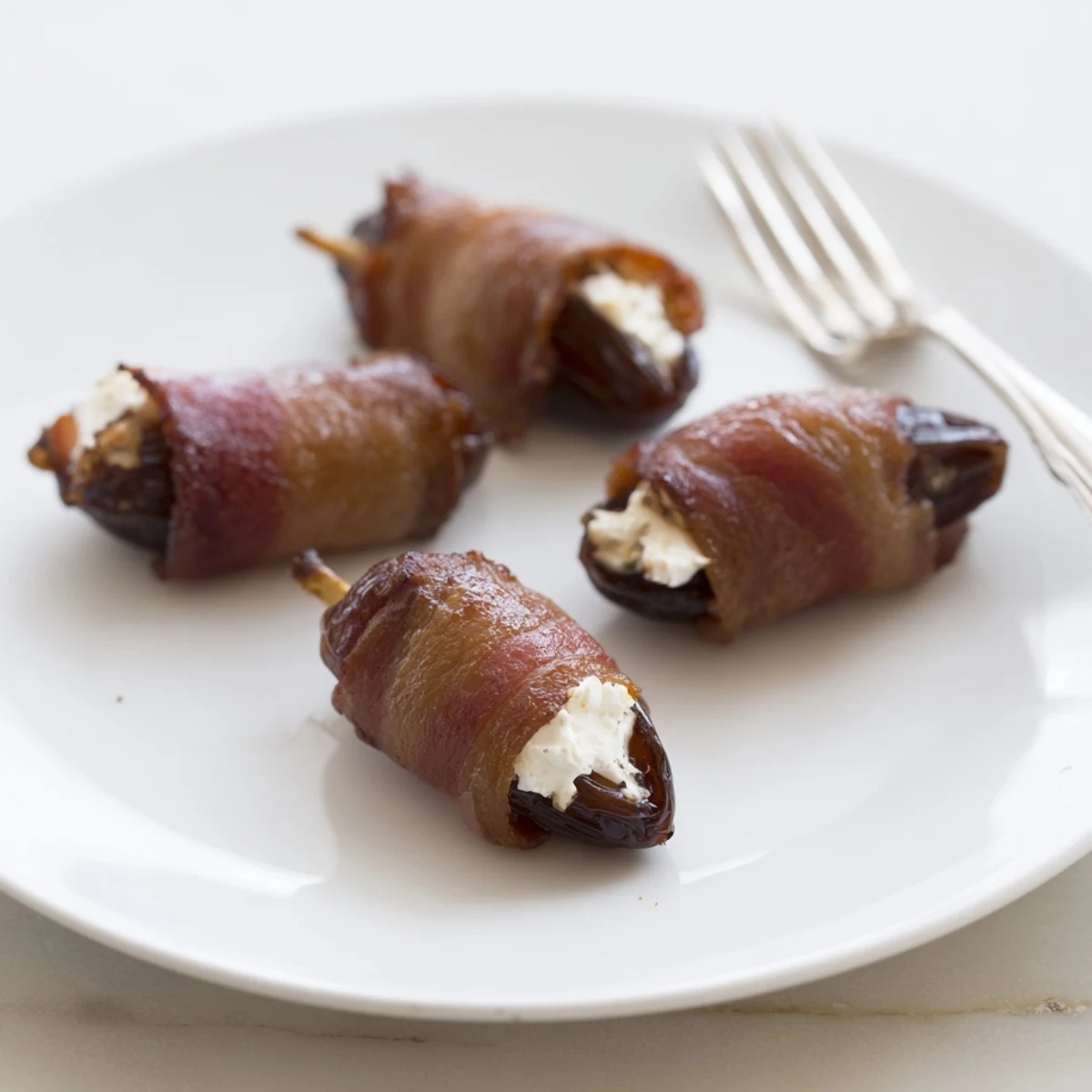 - Wrap each stuffed date with a half-slice of bacon, securing the ends underneath or with a toothpick if needed.