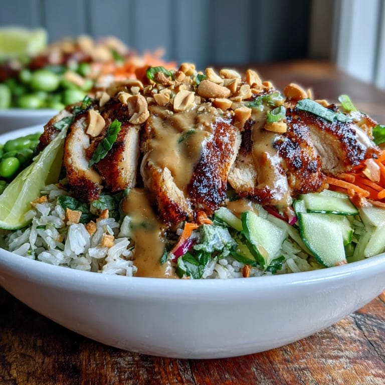 The coconut rice, grilled chicken, and peanut sauce can all be made up to 3 days in advance. Store them separately and assemble bowls just before serving for the freshest texture.