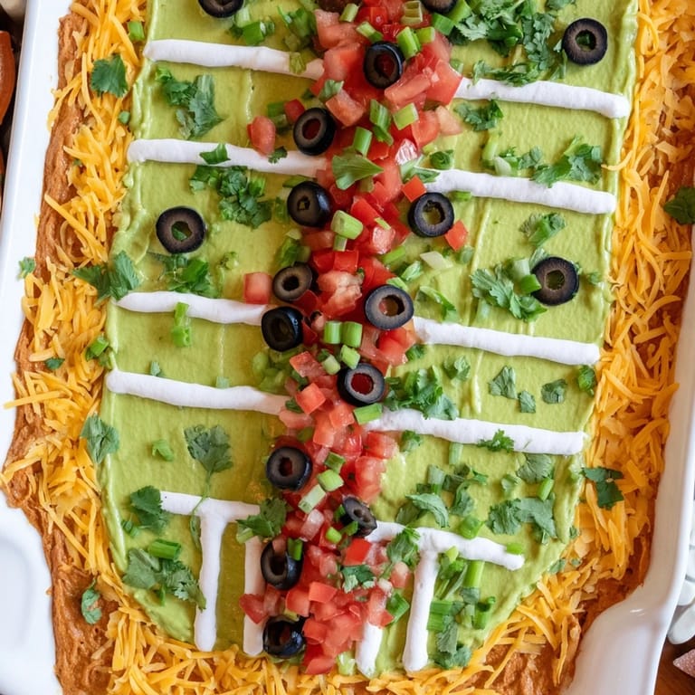 Save to Pinterest A festive and crowd-pleasing layered dip arranged to resemble a football field, perfect for game day gatherings.