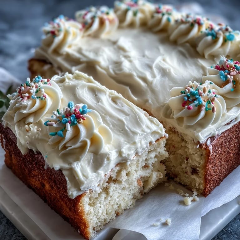 Save to Pinterest There's something about baking a sheet cake for someone's milestone that makes you understand why people call it comfort food. My cousin texted me three weeks before graduation asking if I could make "something simple but special" for her party, and I found myself standing in the kitchen at 6 a.m. on cake day, measuring flour while the house was still quiet. This vanilla sheet cake became the answer because it's the kind of dessert that doesn't demand perfection—it just asks you to show up, mix, and celebrate someone's next chapter with buttercream and a little piping that says exactly who they are.