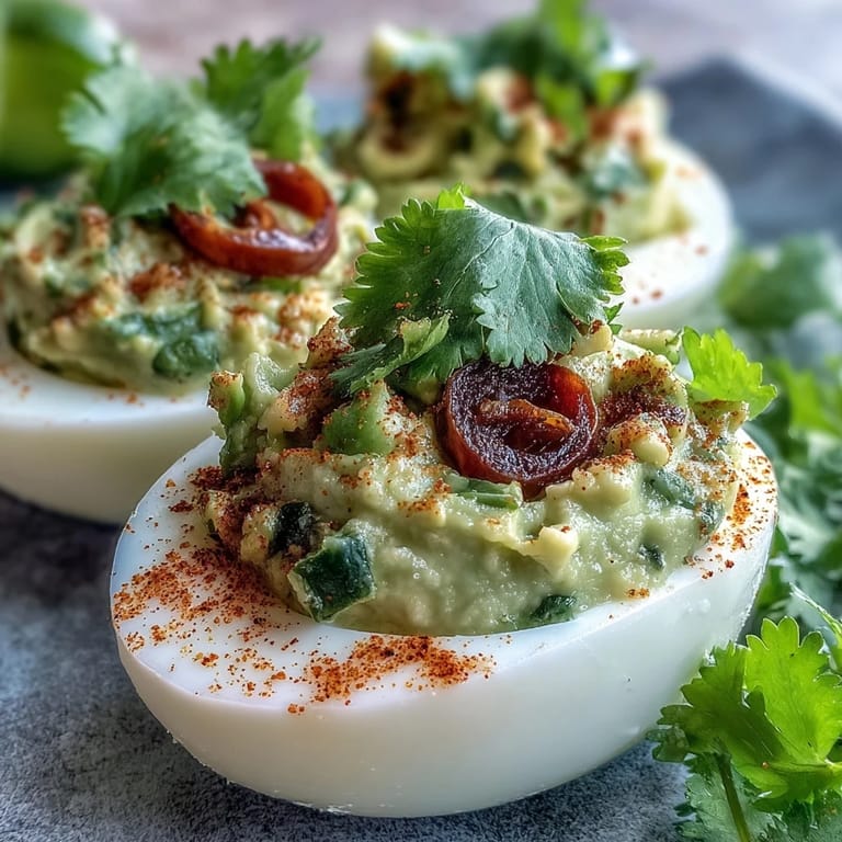 Save to Pinterest The first time I made guacamole stuffed deviled eggs, the kitchen smelled like a citrus grove thanks to freshly squeezed lime. I remember juggling the eggs and avocado while my playlist faded into the background, and suddenly I realized how smoothly both flavors blend together. It wasn’t a planned invention—more a solution to two leftover ingredients. Watching the yolks and avocado turn creamy green felt oddly satisfying. The urge to lick the fork before anyone noticed was nearly irresistible.