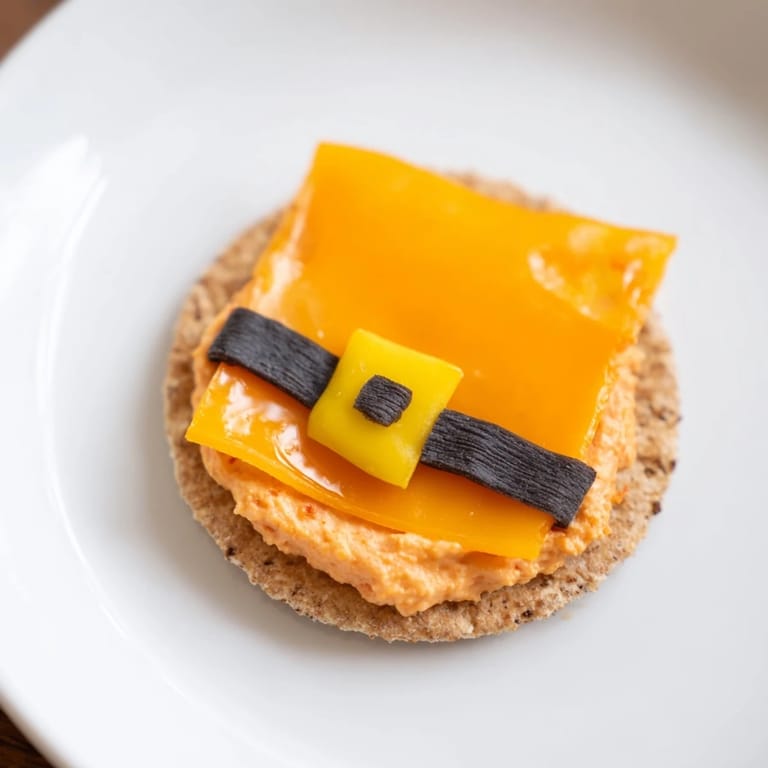 Save to Pinterest Festive and fun, these savory cheese crackers are topped with a creamy roasted red pepper dip and decorated to resemble Santas iconic belt—perfect for holiday gatherings.