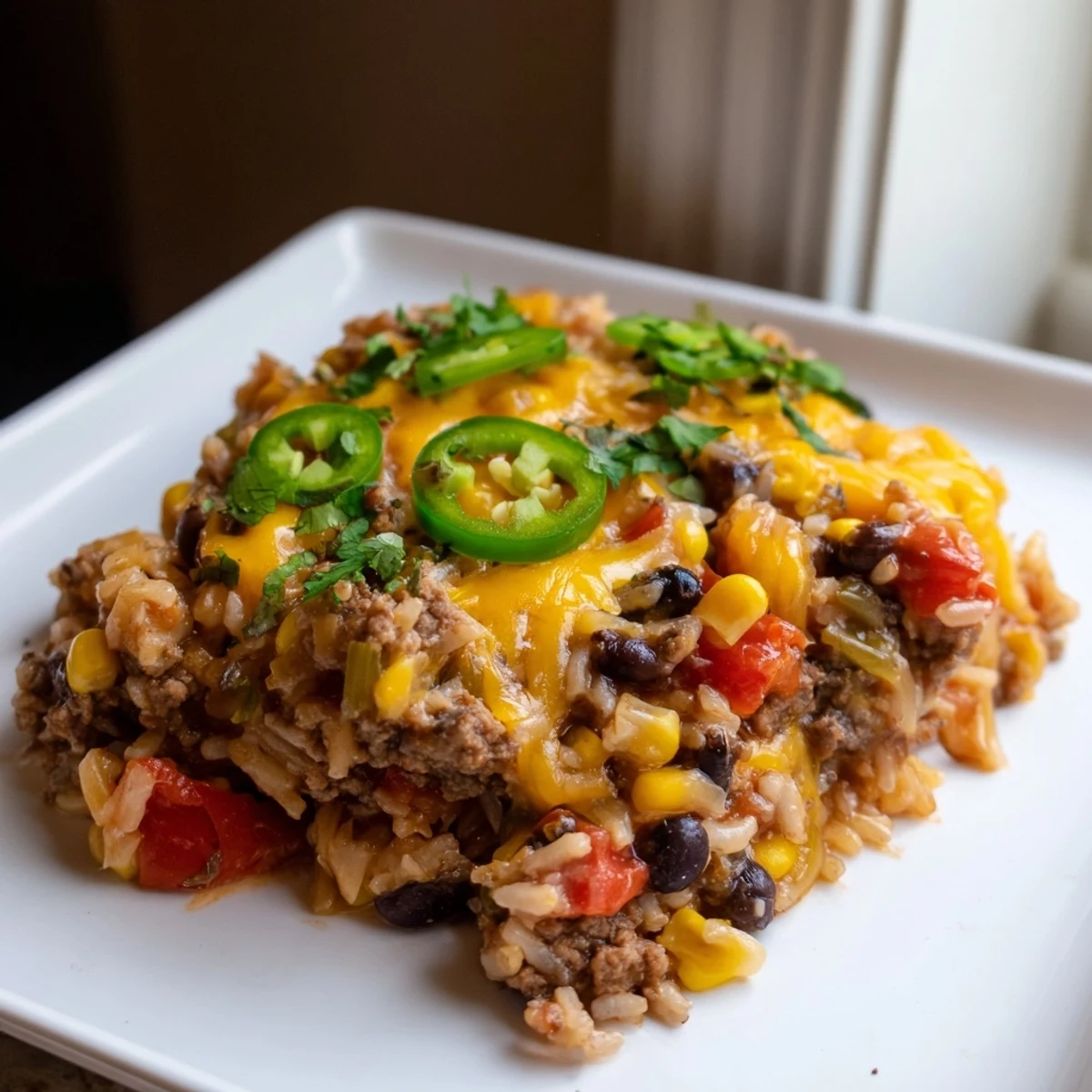 Save to Pinterest A hearty, comforting casserole packed with seasoned ground beef, tender rice, beans, and melty cheese, all baked in a zesty Tex-Mex tomato sauce. This dish is perfect for busy weeknights and always satisfies hunger cravings with bold flavor.