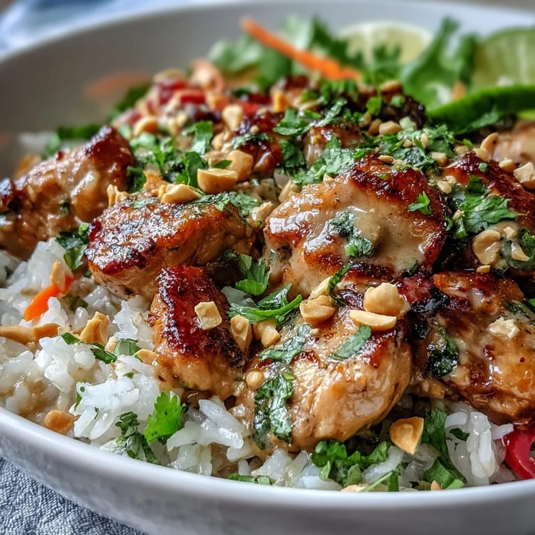 Save to Pinterest Experience the vibrant and bold flavors of Thailand with this Thai Peanut Chicken Bowl. This dish features tender, marinated chicken served over creamy, coconut-infused jasmine rice, complemented by a rainbow of crisp vegetables and a luscious, spicy-creamy peanut sauce. It is a satisfying, flavor-packed meal that is as beautiful to look at as it is delicious to eat.