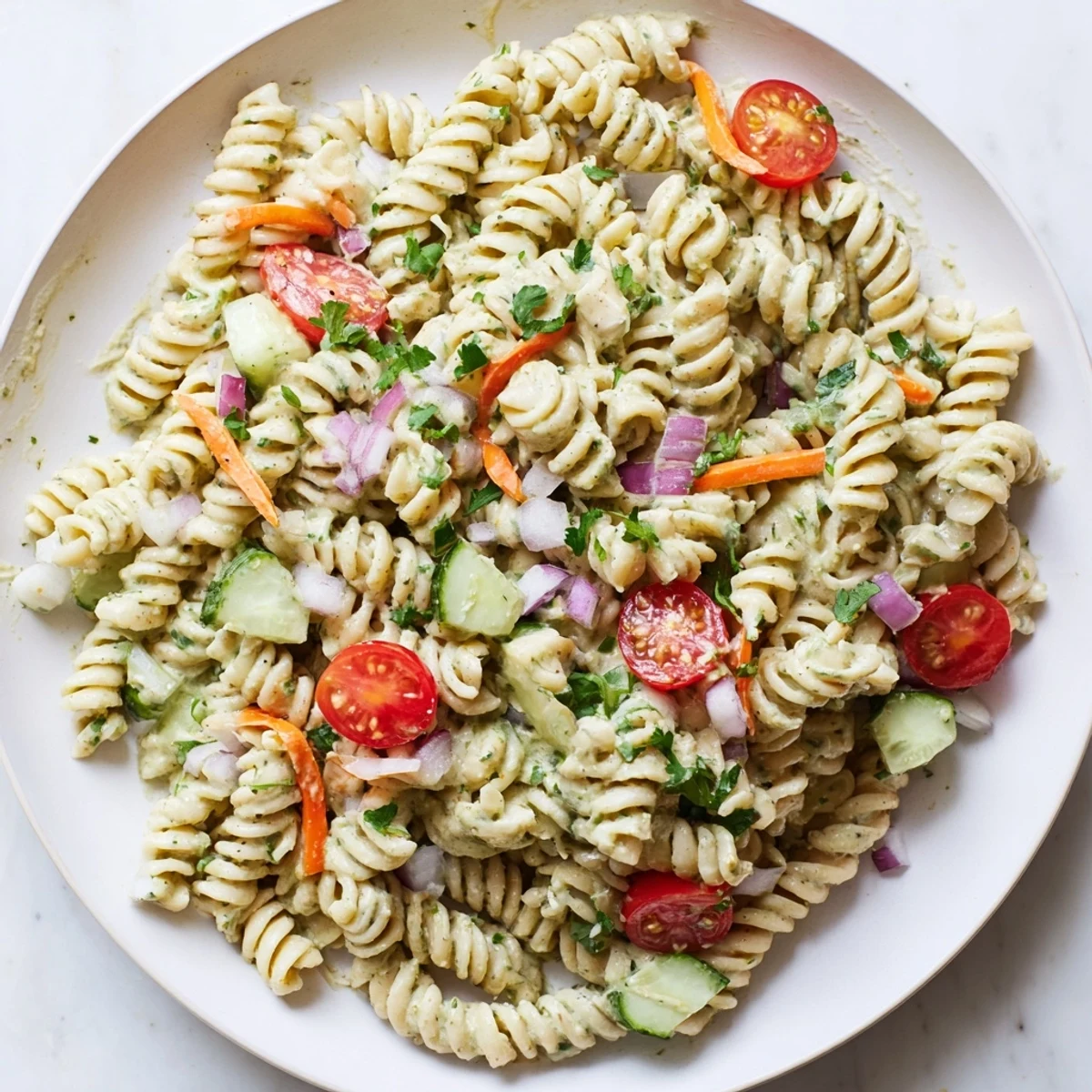Save to Pinterest A creamy, plant-based pasta salad featuring a tangy hemp seed ranch dressing, fresh vegetables, and tender pasta perfect for picnics or meal prep.
